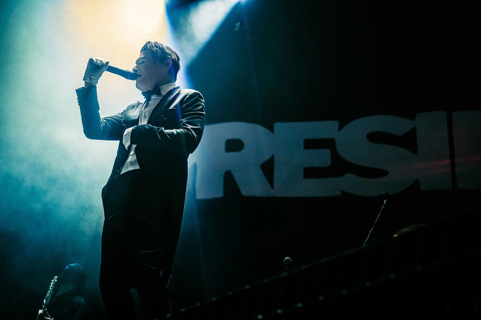 Opening the show was the new enigmatic band from the UK, President, who made their debut last summer at Download Festival in Donnington Park, England. Who is President? Well, that's the question, isn't it? Fronted by an anonymous singer, “The President,” who wears a terrifying Richard Nixon-esque mask, this band blends metalcore with electronica influences. Other members wear black cloth masks, concealing their true identities, are known as Heist (guitar), Vice (drummer), and Protest (bassist). Opening their set with their single “Fearless”, the band meandered out to the stage, with the vocalist appearing behind a podium with the band's insignia in red neon light on the front, giving the illusion that he is addressing the audience in a political forum. The reviews from the crowd seemed mixed; some knew the music and sang along enthusiastically, while others seemed bored. Was this out of genuine disinterest or unfamiliarity with the band? That’s a question I can not answer. In a new wave of anonymous and masked bands, it is hard to tell if President will convert the polls to their favor.